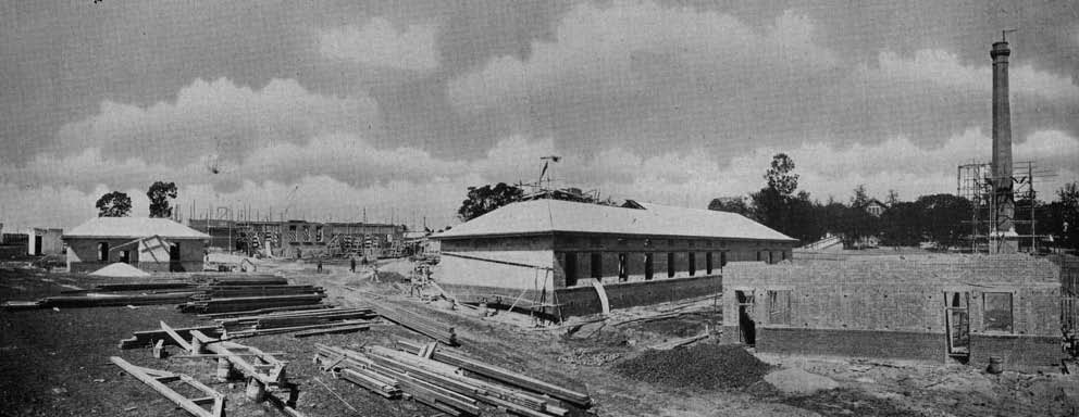 Description: This image refers to the construction of new buildings at the Ipswich Hospital for the Insane in 1913. The caption included with the image states: From left: Sewing Room, Administration Building, Kitchen and Laundry. Qld Parliamentary Papers 1913.