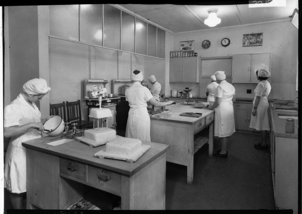 Description: This is a photograph of a cooking class at Ormond, Thornleigh. It shows girls in white uniforms and headscarves performing various tasks in the kitchen under the supervision of a staff member. In the foreground one of the girls is icing a three-tiered wedding cake.