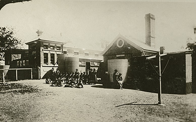 Description: This is a photograph of children at the back of the Cootamundra Training Home for Girls. It shows approximately 25 girls sitting and standing beside water tanks in a gravel yard behind the Training Home.
