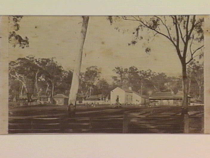 Description: This is a digitised image of Coranderrk Aboriginal Reserve. Several mission buildings can be seen from a distance.