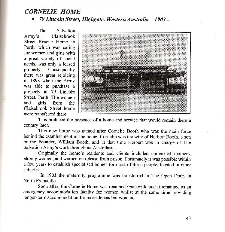 Description: ‘Cornelie Home, Lincoln Street’ is a digital copy of an entry in Southern Soup-Soap-Salvation, a compendium of Salvation Army Social Services in the Australian Southern Territory (p.43). It has some historical information about Cornelie.