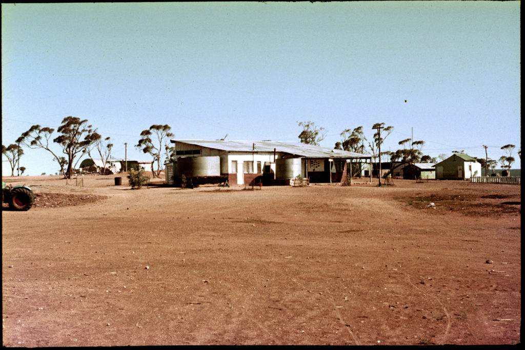 Description: This is a digitised copy of a slide and is part of the group of four images titled ‘Cundeelee [picture]’ held at the State Library of Western Australia. The image shows the outside of the building where the dining hall was at Cundeelee.