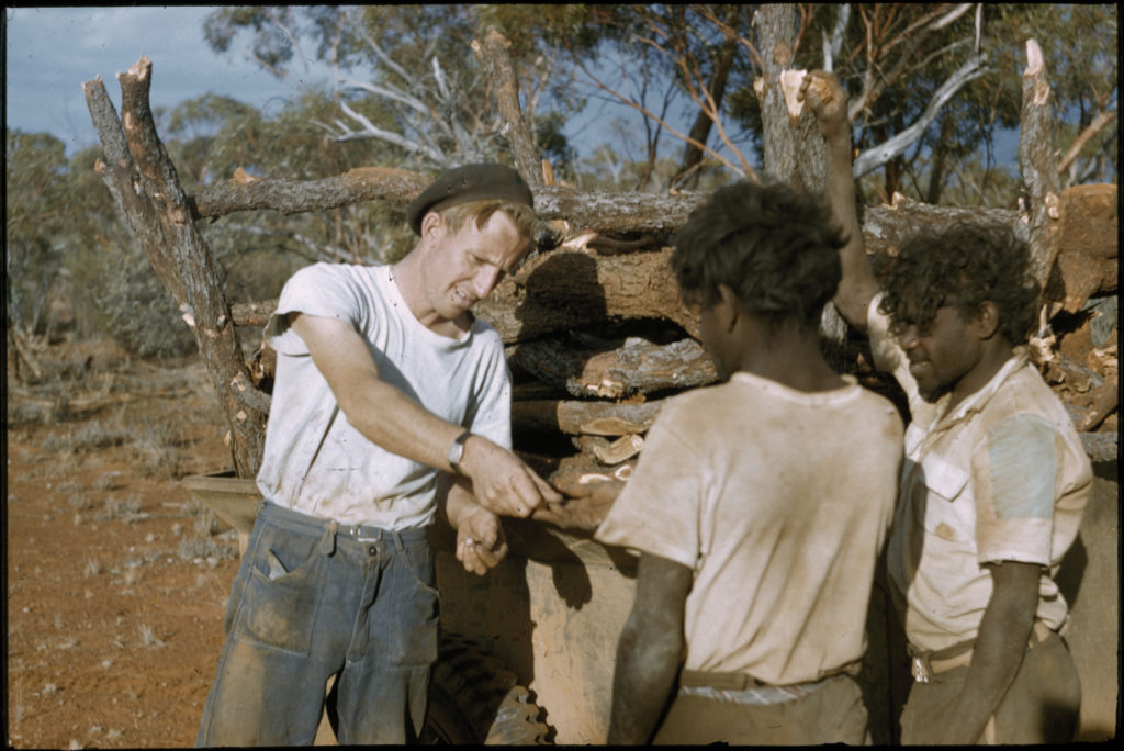 Description: This is a digitised copy of a slide and is part of the group of four images titled ‘ Collecting sandalwood at Cundeelee, May 1957 [picture]’ held at the State Library of Western Australia. The image shows David Smith paying Aborigines for collecting sandalwood at Cundeelee.