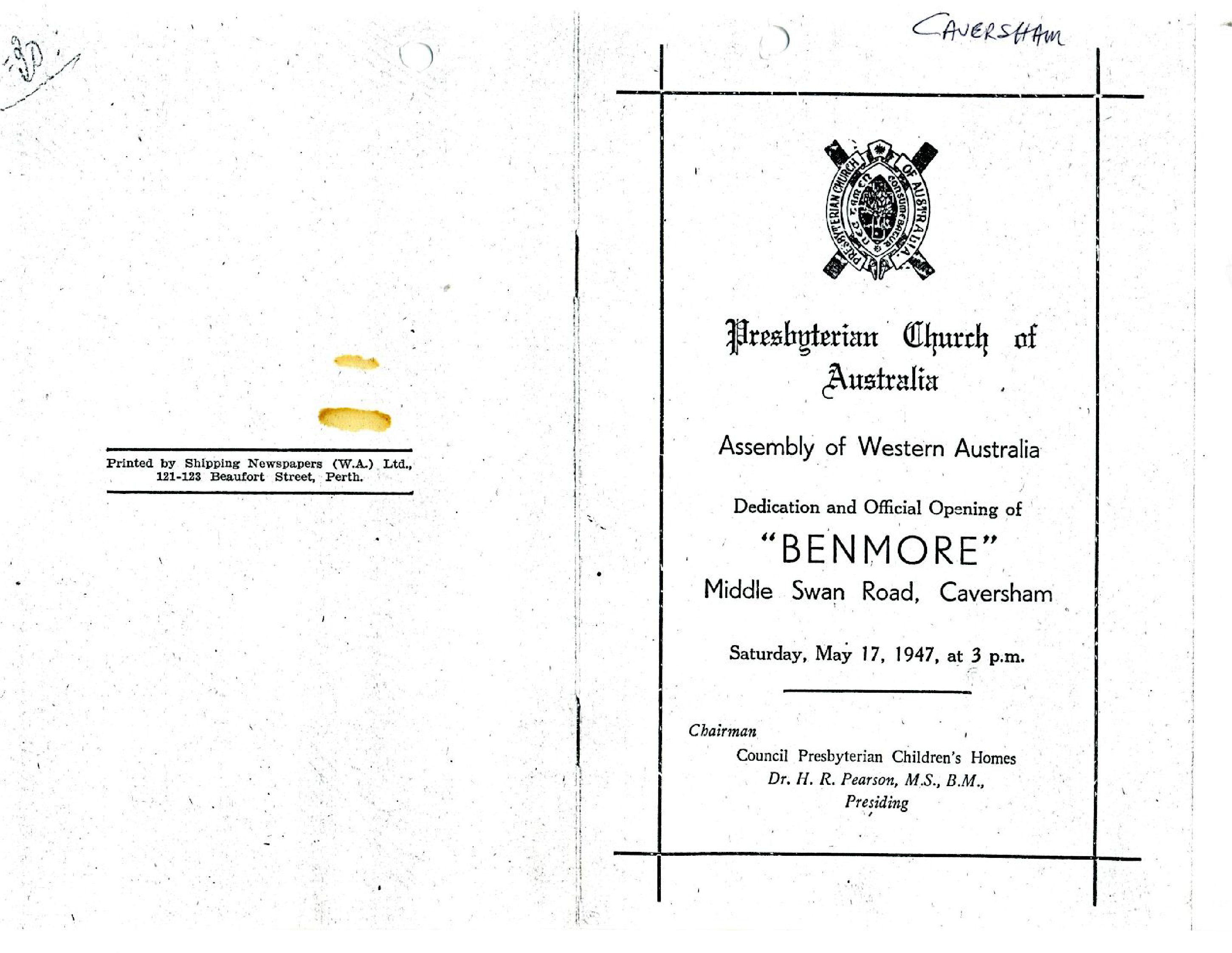 Description: ‘Dedication and Official Opening of Benmore’ is a digital copy of the program printed for the opening of the Benmore Presbyterian Children’s Home in 1947. It has images and history about the Benmore and Burnbrae Presbyterian Children’s Homes, a plan of Benmore and a list of the Home’s ‘needs’. A photocopy of this program is held in the Uniting Church (Synod of Western Australia) Archives.