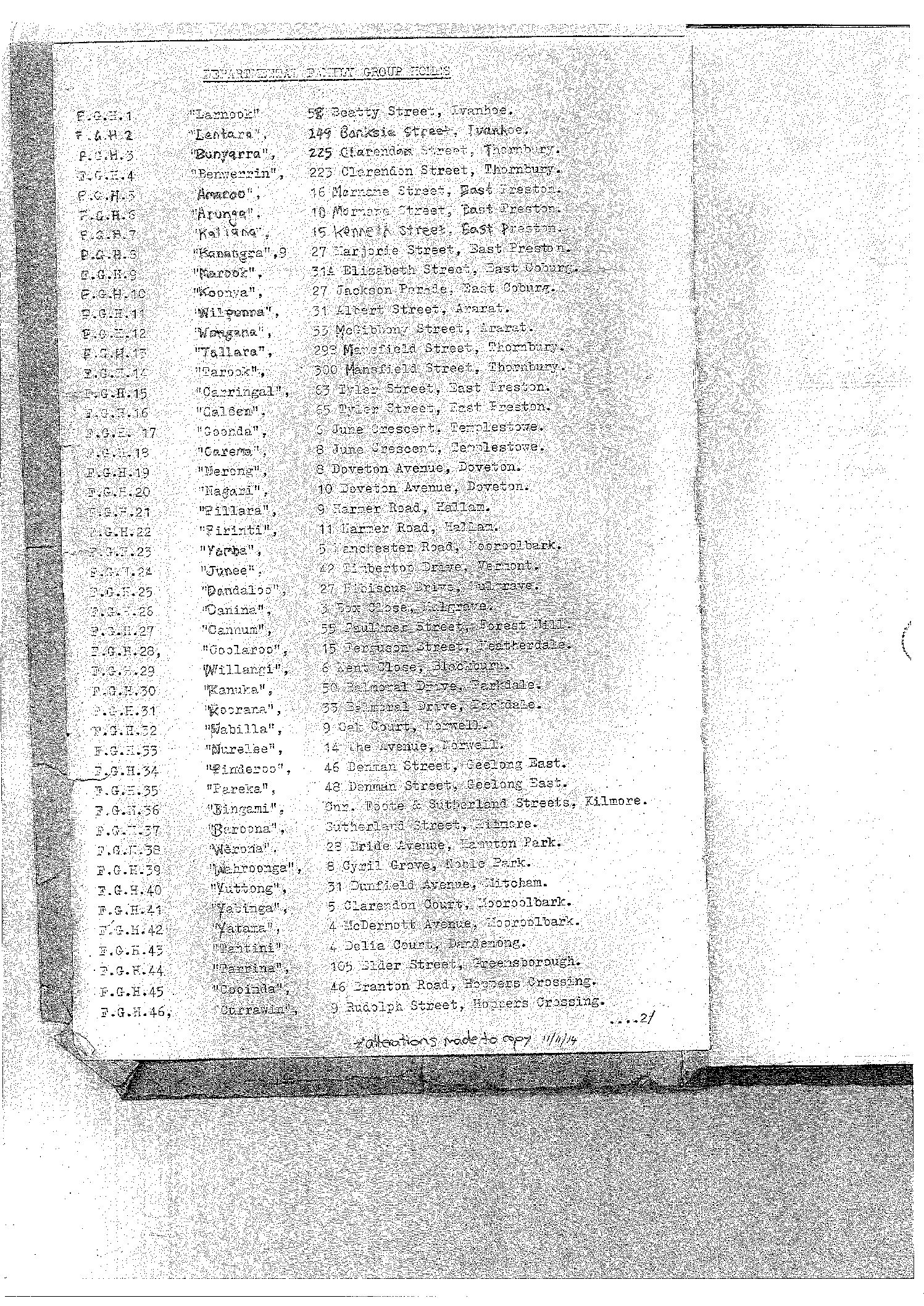 Description: This is a digital copy of a document showing lists of Family Group Homes in the 1970s. The date ‘November 1977’ was supplied by staff of the Department of Human Services. There is an annotation on this copy of the document: “*alterations made to copy 11/11/14”.
