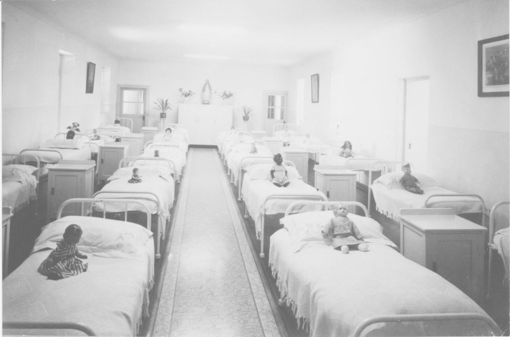 Description: ‘Dormitory, St Joseph’s Girls Orphanage’ is a digital copy of an undated photograph from the Institute of Sisters of Mercy of Australia and Papua New Guinea Archives and Heritage Centre. It shows a dormitory at the St Joseph’s Girls’ Orphanage. An approximate date range of 1920s to 1960s has been given, based on the style of the dolls on the beds. It is possible that the picture was taken when the dormitory was decorated for a special event.