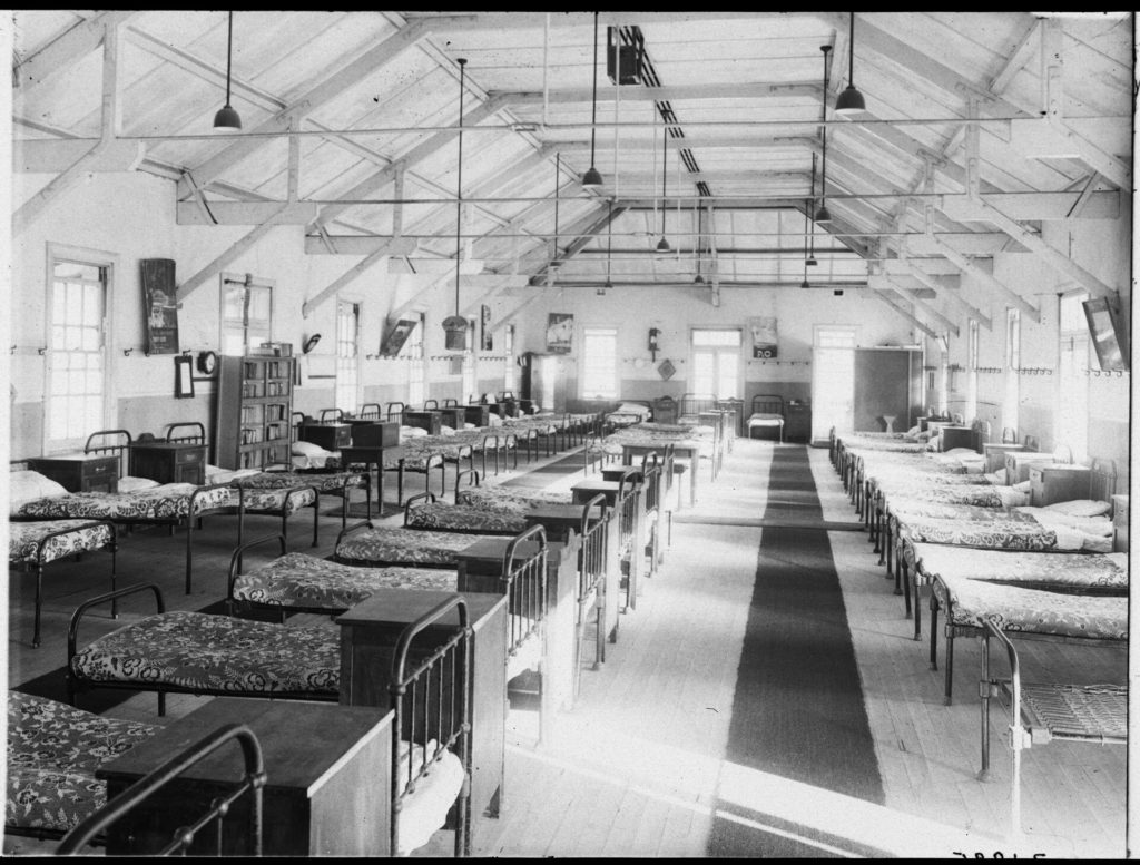 Description: This is a photograph of the boys dormitory at Gosford Training School. It shows three rows of steel-framed beds and bed-side dressers in a long, high-ceilinged hall.