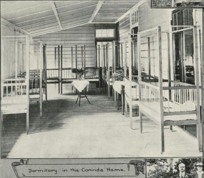 Description: This is an image of a dormitory at the Corinda Infants’ Home. It shows approximately 10 empty cots lined up along the walls of what appears to be an enclosed or converted verandah. The only other furnishings in the room are two small tables, each with a vase of flowers on top. This image was published in the Queenslander Pictorial, a supplementary publication to The Queenslander, on 29 June 1918. The caption was supplied by the Queenslander Pictorial.