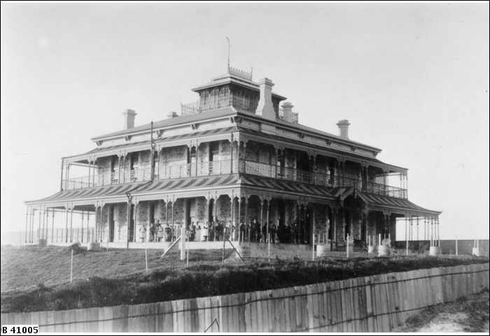 Description: This image of Estcourt House shows adults and children who lived in the Home standing on the verandah.