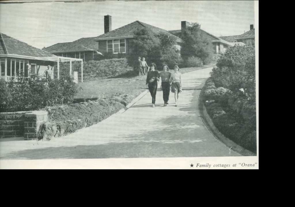 Description: This is an image of Orana at Burwood. It shows six children standing in the grounds of the Orana complex, with four of the cottages visible in the background.