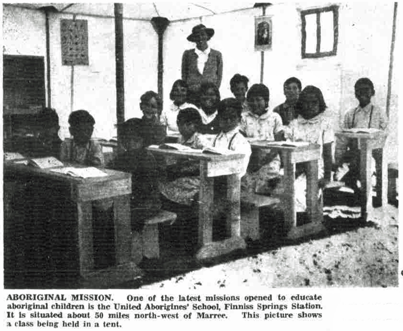 Description: This image was included in The Adelaide Chronicle on Thursday 14 December 1939, it relates to Finniss Springs Mission. The caption stated: ‘Aboriginal Mission – One of the latest missions to educate aboriginal children is the United Aborigines’ School, Finniss Springs Station. It is situated about 50 miles nort-west of Marree. This picture shows a class being held in a tent.’