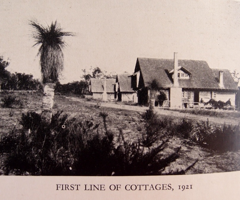 Description: ‘First line of cottages, 1921’ is a photograph from Fairbridge, Pinjarra, showing three two-storey cottages with pitched roofs facing a dirt road, opposite open grassland.