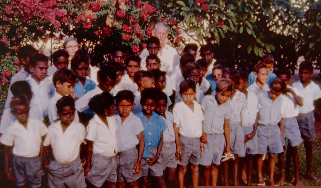 Description: ‘Fitzroy Crossing UAM hostel boys, 1960s’ is an image published in Mowanjum: 50 years community history (p.205). The caption names one of the boys and reads in part, ‘station boys at the United Aborigines Mission hostel in Fitzroy Crossing in the 1960s’. The photo shows approximately 40 boys standing in rows in front of some trees. They are wearing what look like school uniforms of grey, blue, or white button-up shirts and grey shorts. An elderly couple stand behind the group of boys.