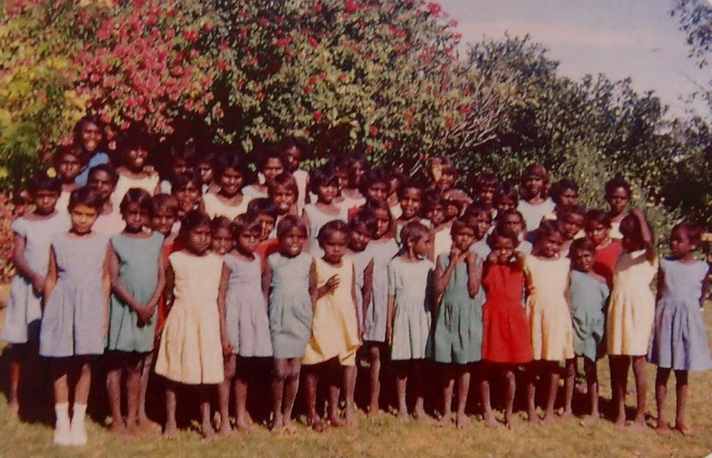 Description: ‘Fitzroy Crossing UAM hostel girls, 1960s’ is an image published in Mowanjum: 50 years community history (p.205). The caption names one of the girls and reads in part, ‘station girls at the United Aborigines Mission hostel in Fitzroy Crossing in the 1960s’. The photo shows approximately 40 girls and standing in three rows in front of some trees. They are all dressed in matching blue, green, yellow, or red dresses.