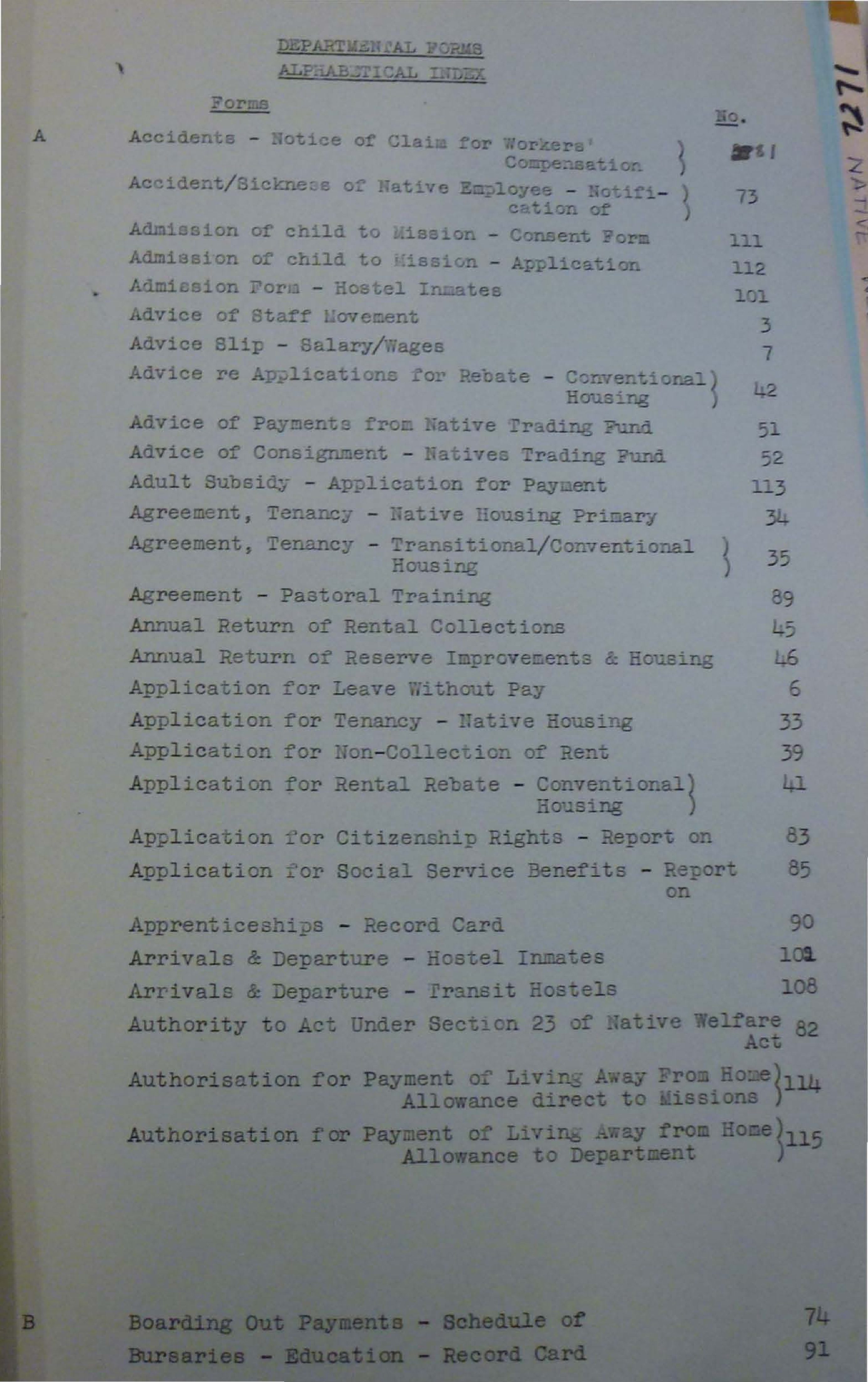 Description: This is a digital copy of an archival item held at the State Records Office of Western Australia (‘Form manual’). The item is a collection of forms used by the Department of Native Welfare between 1955 and 1972, approximately. The pages that have been included in this version are relevant to the out-of-home-care of Aboriginal and non-Aboriginal children in WA.