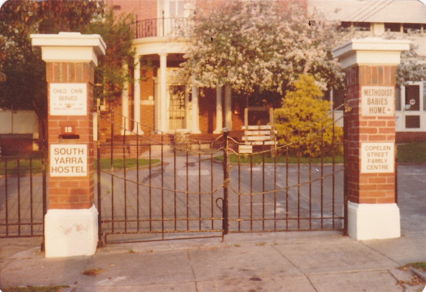 Description: This is a copy of an image of the front gates at 12 Copelen Street, South Yarra. At the time this photo was taken, the buildings housed the Copelen Street Family Centre. The South Yarra Hostel was next door. There are signs on the gate for the Methodist Babies’ Home (previously located on the list, closed in 1974), South Yarra Hostel, Copelen Street Family Centre and the Presbyterian and Methodist Child Care Service.
