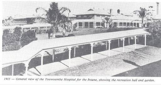 Description: The image include the following caption: 1915 – General view of the Toowoomba Hospital for the Insane, showing the recreation hall and garden.