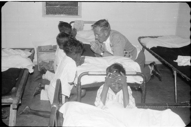 Description: This is a digitised copy of a negative and is part of the group of nine images titled ‘Getting ready for bed at Cundeelee [picture]’ held at the State Library of Western Australia. The image shows boys praying with an adult.