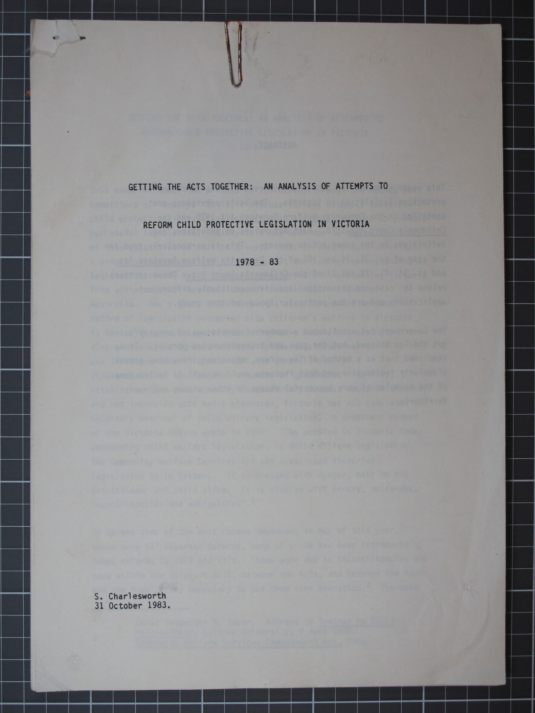 Description: A report by S. Charlesworth about the difficulties of achieving reform of child welfare legislation in Victoria, particularly the Community Welfare Services Act 1970 and the Children’s Court Act 1973, between 1978 and 1983.