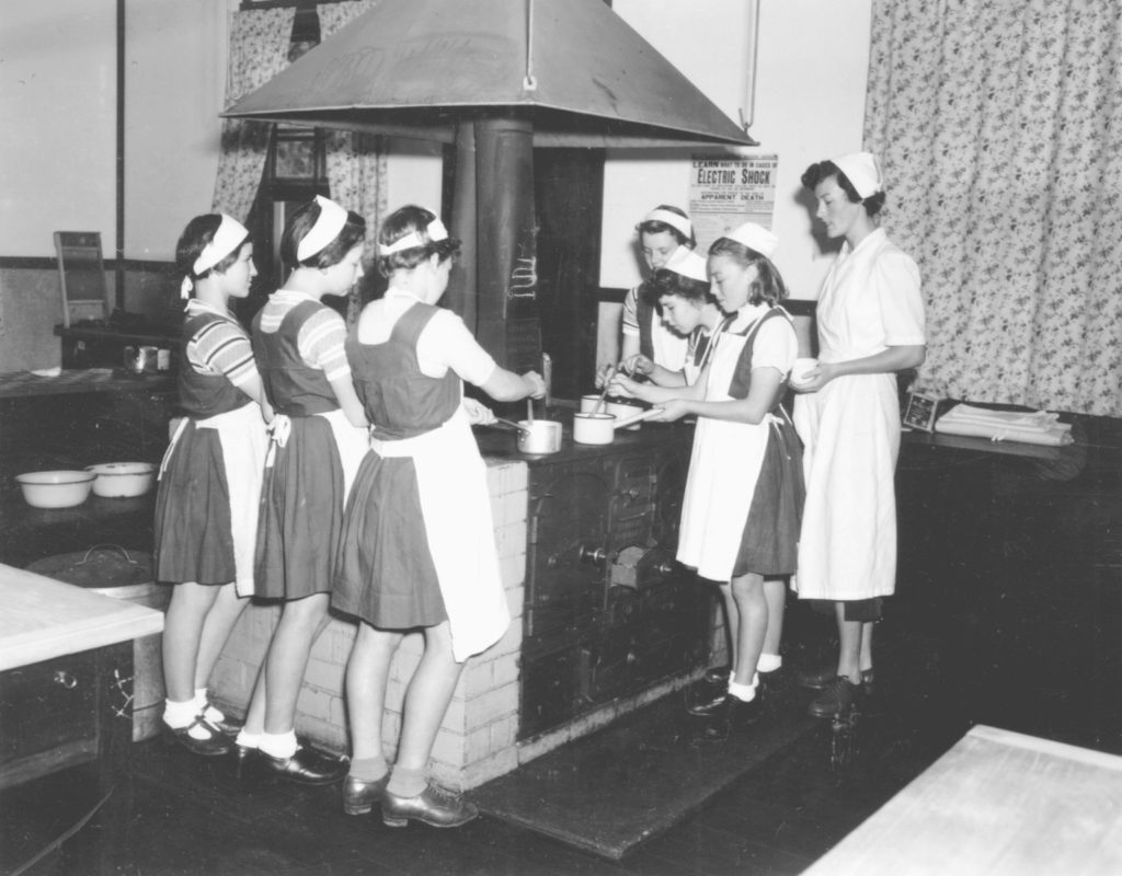 Description: This is a digitised copy of a photographic print and is part of the Government Photographer collection held at the State Library of Western Australia. The images shows girls cooking in front of a teacher at Fairbridge Farm, Pinjarra, in 1953