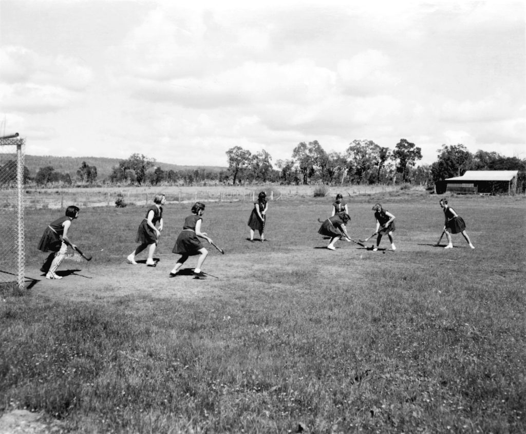 Description: This is a digitised copy of a photographic print and is part of the group of four images titled ‘Playing sport at Fairbridge Farm [picture]’ held at the State Library of Western Australia. The image shows girls playing hockey at Fairbridge Farm School.