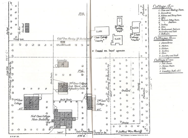In October 1891, all girls at the Girls’ Reformatory, Magill moved, along with the matron, Mary E Holden, to Edwardstown. The new purpose built Reformatory was set on an eleven-acre (4.4 hectare) property. Three cottage-style housing units, named Charity, Faith and Hope, had been built on part of the property and this area was surrounded by a high galvanised iron fenced topped with barbed wire.