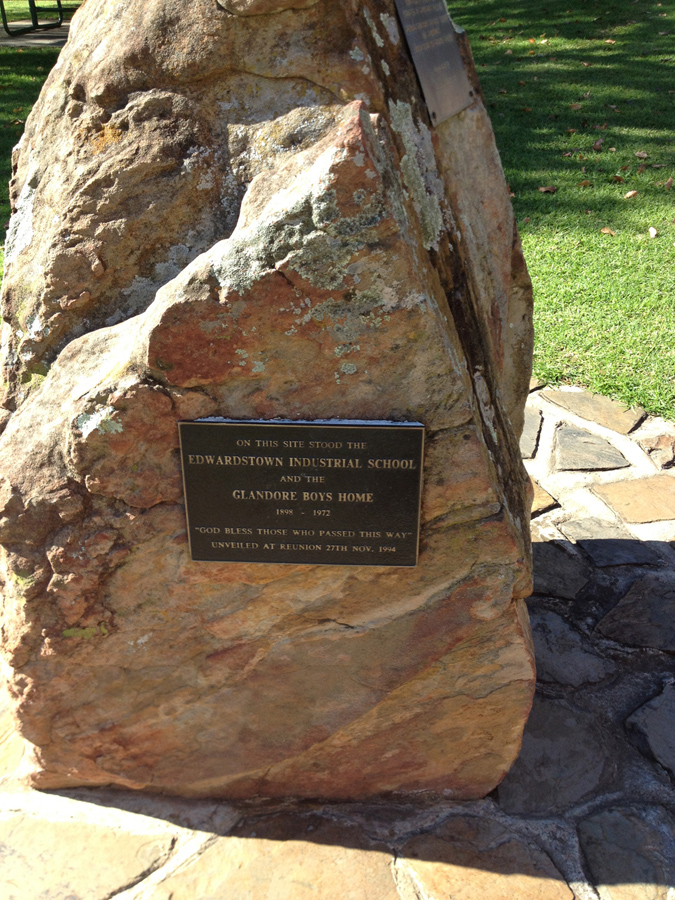Description: This is a photograph showing the position of the memorial plaque to the Edwardstown Industrial School and the Glandore Boys Home, embedded in a rock.