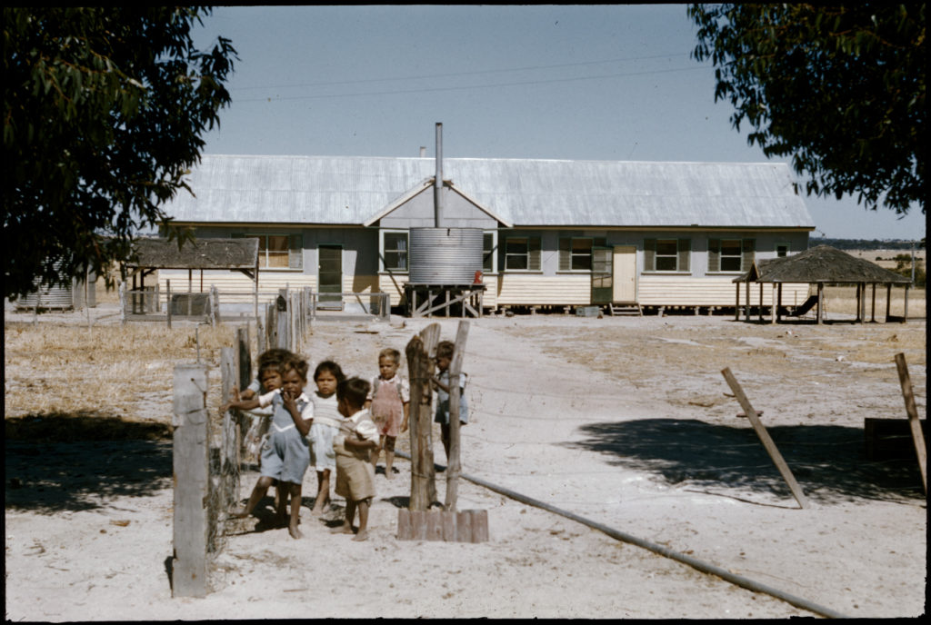 Description: This is a digitised copy of a slide and is part of the group of six images titled ‘Gnowangerup Mission run by the United Aboriginal Mission, January 1958 [picture]’. The image shows young children outside at Gnowangerup Mission.