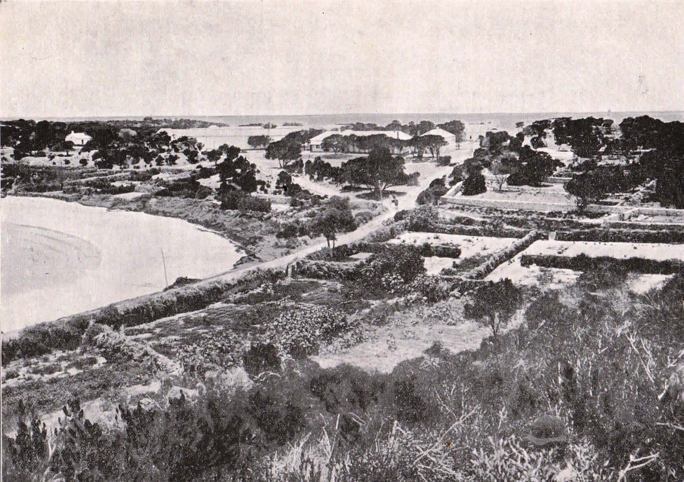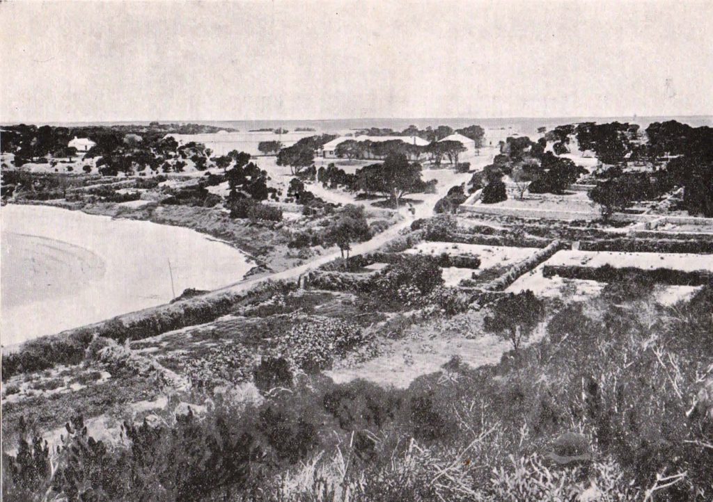 This image shows the coast of Rottnest Island, with the reformatory buildings in the near distance, and what appear to be garden lots in the foreground. The reformatory site is partially obscured by trees, but looks to be made up of at least four large stone buildings, with a smaller cottage off to the left.