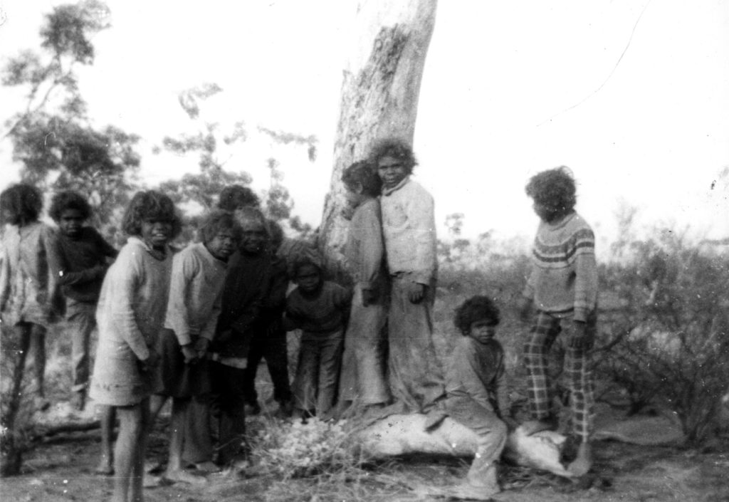 Description: This is a digitised copy of a photographic print and is part of the group of seven images titled ‘Cundeelee Mission [picture]’ held at the State Library of Western Australia. The image shows a group of children standing on a tree log at Cundeelee.
