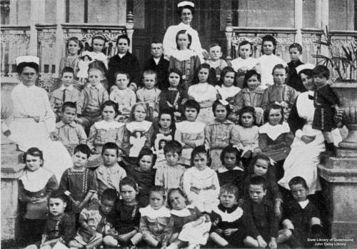 Description: The Library description states: Matron, sisters and children of the Queen Alexandra Home for children at Coorparoo, Brisbane, Queensland. Children are dressed in uniforms and day clothes.