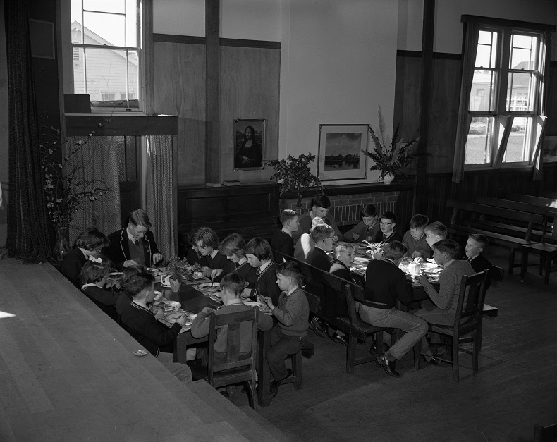 Hagley Farm School, corner school canteen, prefects in charge of tables