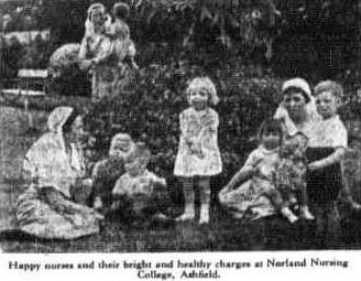 Description: This is a copy of an image published in The Farmer and Settler on Friday 8 December 1944. The image shows nurses and children in the garden at the Norland Nursing College, Ashfield and was included in the article Norland offers good career for girls.
