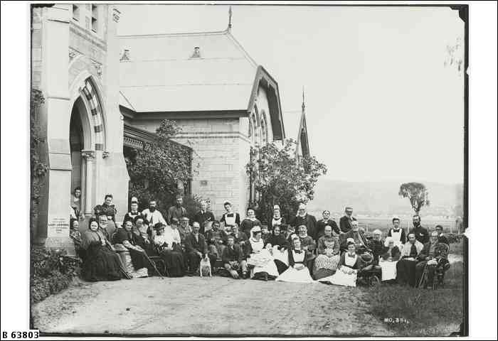 Description: The library description states: Nurses and their patients assembled outside the Home For Incurables at Fullarton, 21 October 1893