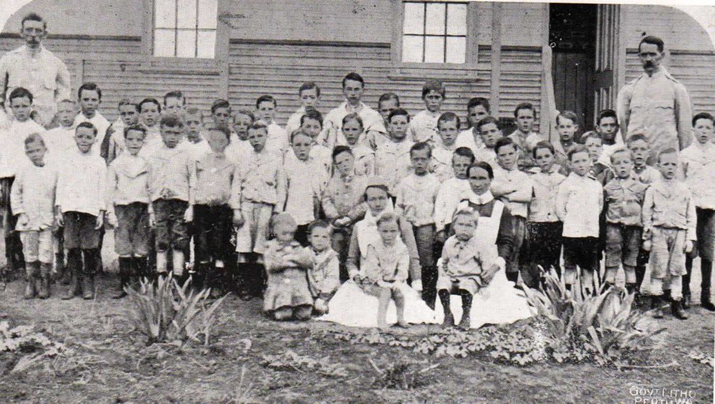 This image shows a group of approximately 40 young boys in front of a timber-framed building. The boys range in age from about 3 to 10 years old. They are wearing a uniform of light-coloured shirts, collars, light or dark coloured pants or shorts, and boots. Two female staff members are kneeling in front of the group, with the youngest children seated besides them or on their knees, and two male staff members stand behind the group.