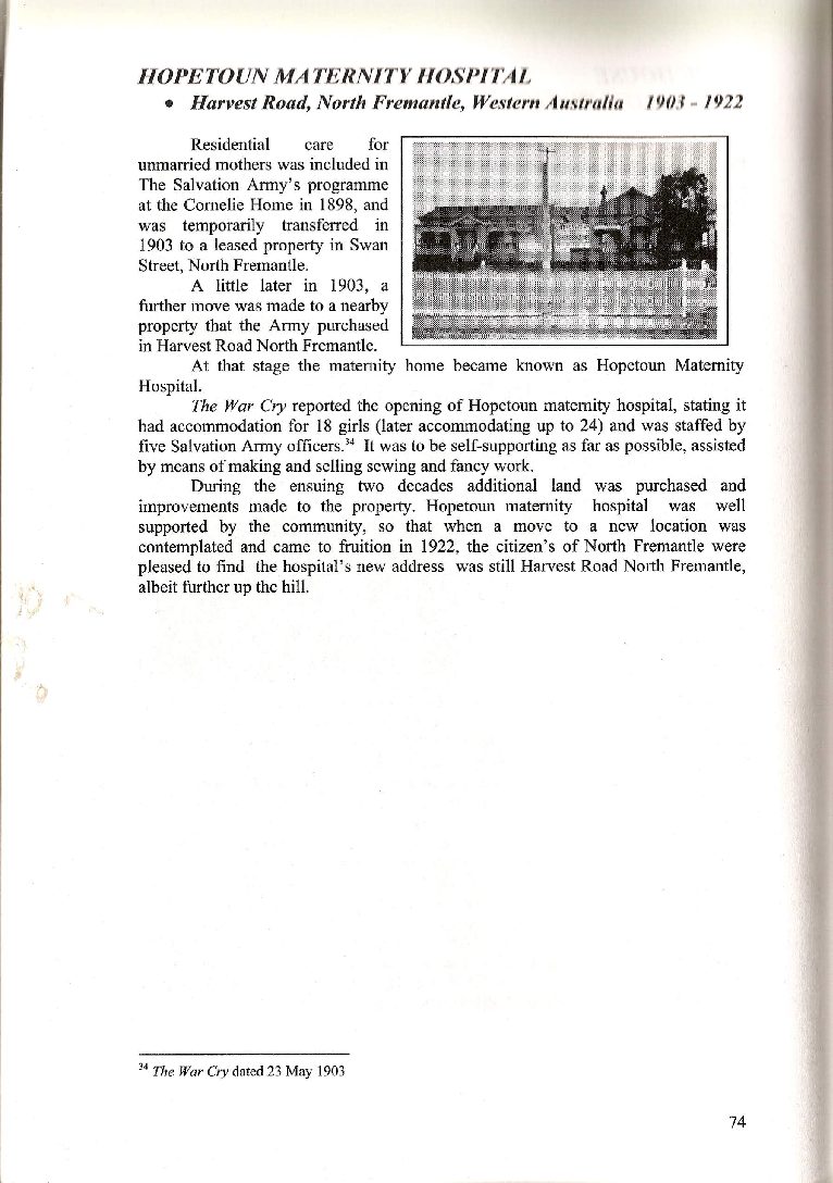 Description: ‘Hopetoun Maternity Hospital, Harvest Road, North Fremantle’ is a digital copy of an entry in Southern Soup-Soap-Salvation, a compendium of Salvation Army Social Services in the Australian Southern Territory (p.74). It has some historical information about the Hopetoun Maternity Hospital, which became known as Hillcrest.
