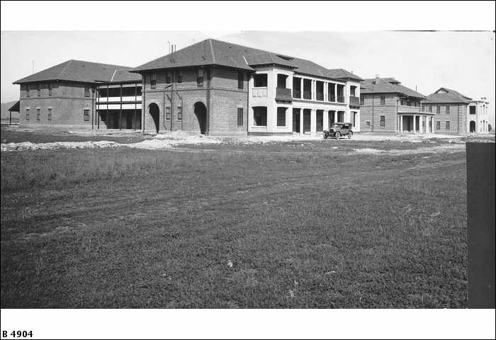 Description: The library description states: The new hospital buildings are two storey and built from brick with tiled roofs. White pillared verandahs and porticos give a colonial appearance. After much controversy and many delays the Hospital was finally opened early 1933. The car parked in front of the buildings is a Dodge, registered to the South Australian Government Architect-in-Chief’s Office. [On back of photograph] ‘Reproduced in the ‘Advertiser’, December 19, 1928 / Infectious Diseases Hospital, Yatala (Section 324) / Nurses’, domestic and administration blocks / 1928′.