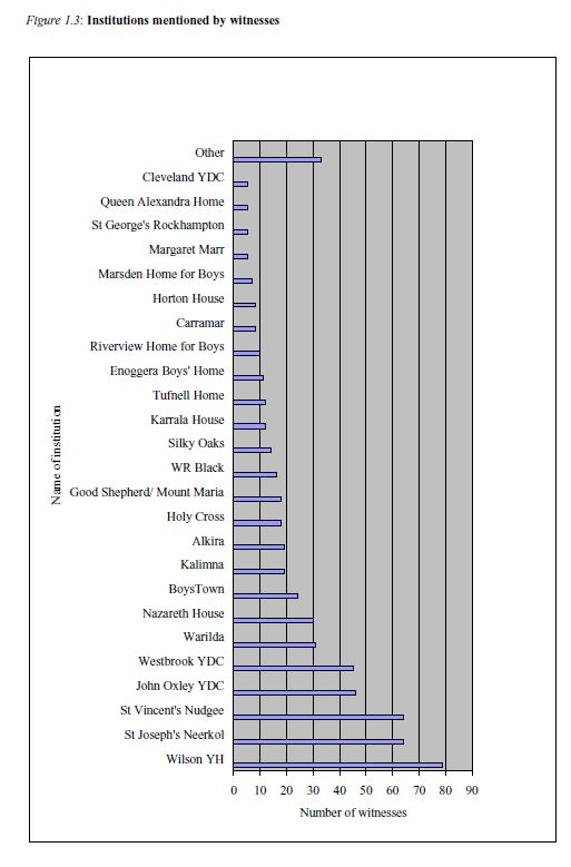 Description: This is a figure that was published on p.8 of the report of the Commission of Inquiry into Abuse in Queensland Institutions, to represent the extent to which institutions were mentioned in evidence during the Inquiry.