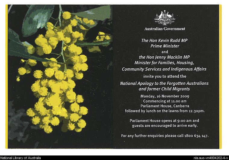 Invitation from Kevin Rudd and Jenny Macklin to the National Apology to the Forgotten Australians and Former Child Migrants, Parliament House 16 November 2009.