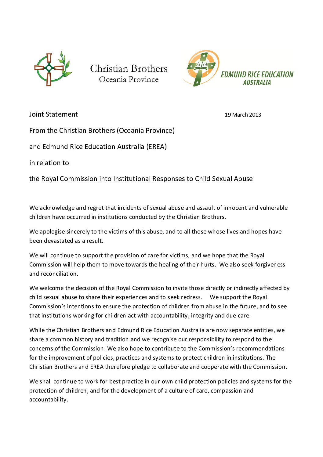 Description: ‘Joint Statement from the Christian Brothers (Oceania Province) and Edmund Rice Education Australia (EREA) in relation to the Royal Commission into Institutional Responses to Child Sexual Abuse’ offers an apology and provides information about mandatory reporting, support and redress services for people who were abused in schools and institutions run by the Christian Brothers in Australia. The statement was issued prior to the first sitting of the Royal Commission into Institutional Responses to Child Sexual Abuse.