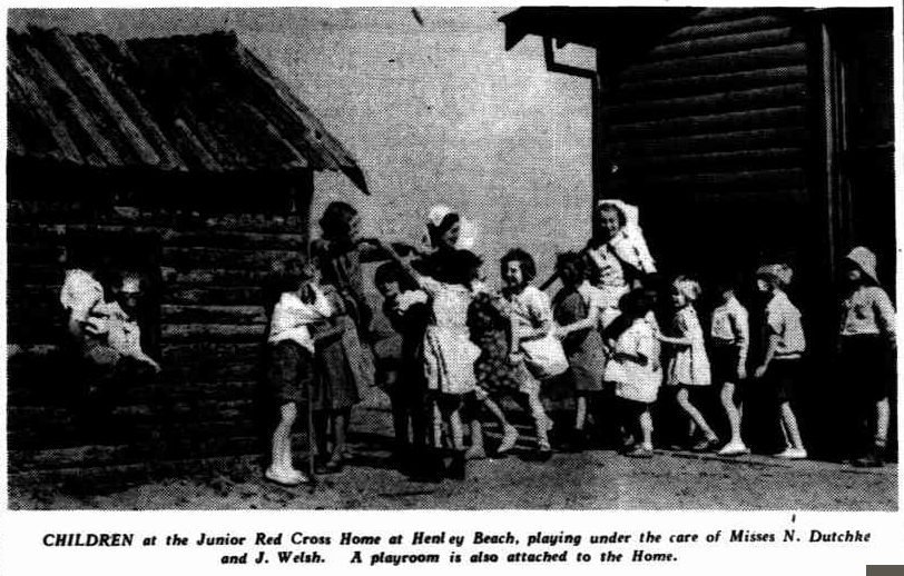 The caption states: Children at the Junior Red Cross Home at Henley Beach, playing under the care of Misses N. Dutchke and J. Welsh. A playroom is also attached to the Home.