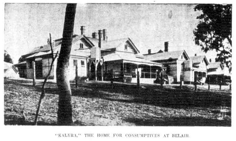 The Kalyra Sanatorium opened in Gloucester Avenue, Belair, in 1894 as a Home for people suffering from tuberculosis. It was run by the James Brown Memorial Trust which opened Estcourt House in the same year. The first patients were admitted to the sanatorium in 1895. A new wing with 12 private rooms was added in 1902. Both adults and children suffering from tuberculosis were patients at Kalyra, some for many years. In its later years the institution became known as Kalyra Hospital. It closed in 1988 and reopened in 1989 as an aged care facility.
