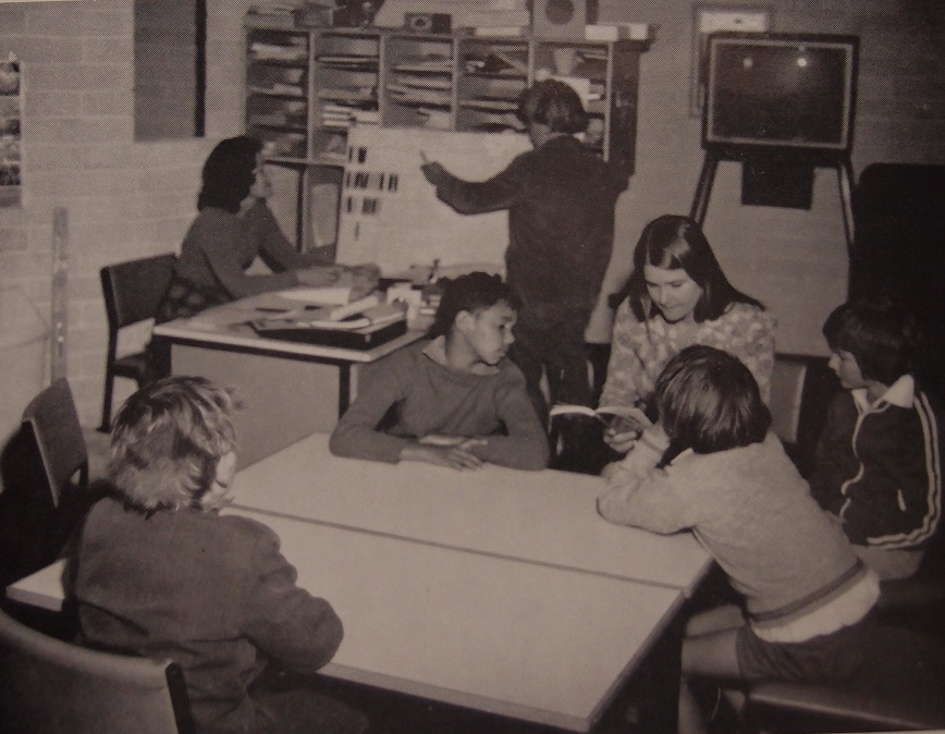 Description: ‘Koorana, in class’ is a digital copy of an image included (p.52) in the Annual Report 1975 of the Department for Community Welfare. The caption reads, ‘Remedial teaching is done individually or in small groups. Children record their own performances.’