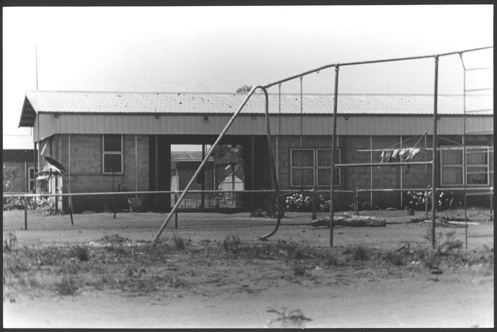 Description: National Library of Australia summary: “Inappropriate housing and metal play equipment which became hot in the sun and unsuitable for use at La Grange Mission.”