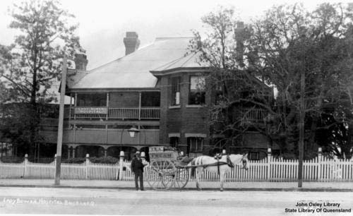 The Lady Bowen Hospital, situated in Ann Street, Brisbane, was previously known as the Queensland Lying-In Hospital. It was renamed the Lady Bowen Hospital, after the wife of Queensland’s first governor, in November 1867. The Lady Bowen Hospital provided hospital care for indigent, unmarried and destitute women of Queensland and their babies. On 29 December 1889, the new Lady Bowen Hospital, located at 497-535 Wickham Terrace, Spring Hill, was opened. A Ladies Committee ran the hospital from 1864 to 1924 when the government’s newly created Brisbane and South Coast Hospitals Board took control. The Lady Bowen Hospital closed on 25 March 1938 when the new Brisbane Women’s Hospital was opened at Herston.