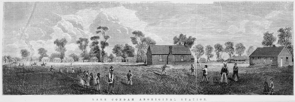 Description: This is an image of the Lake Condah Aboriginal Mission. It was published in the “Illustrated Australian News for Home readers.’ It shows the Aboriginal settlement, with a cricket game in progress in the foreground.