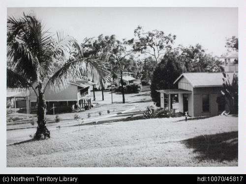 Description: This image shows the Leprosarium at East Arm, the Catholic Church is on the right.