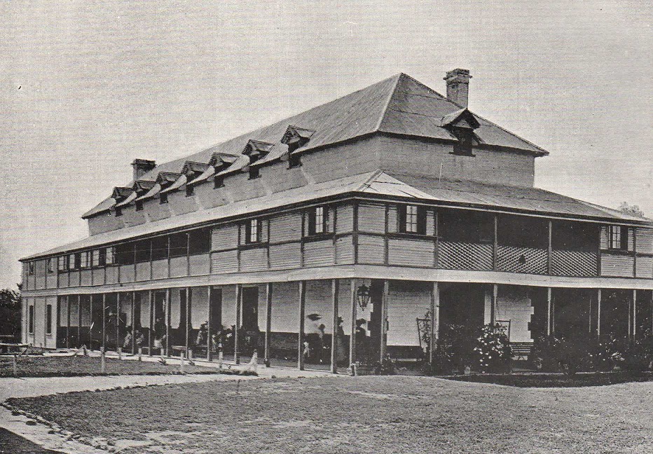 This image shows a long three-storey stone building with a wrap-around verandah on the ground floor, and enclosed verandahs on the first floor. Several women and children can be seen walking along the ground-floor verandah.