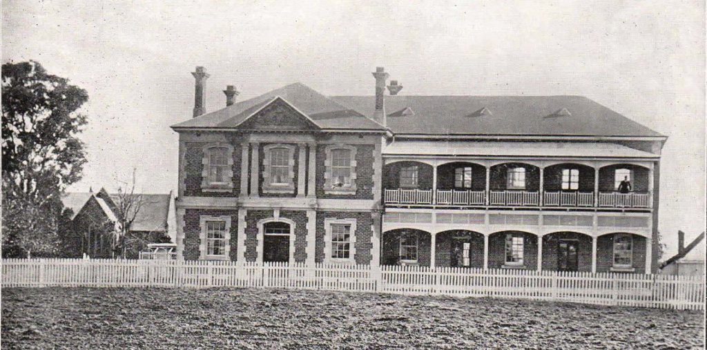 This image shows a large two-storey brick building with a large main entrance and one wing on the right hand side, and a church in the background. A person can be seen standing on the upper verandah of the building.