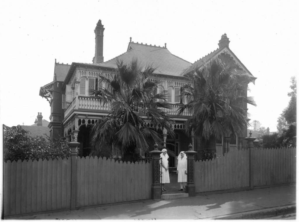 Description: This is a photograph of the front of the Tresillian Home, Petersham. It shows two nurses in white uniforms standing at the entrance to an ornate two-storey house with palm trees in the front yard.